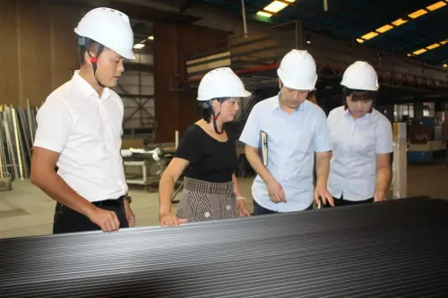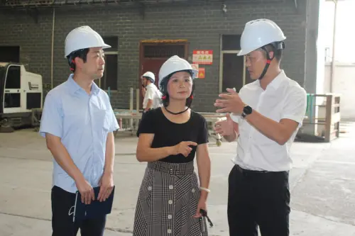 图注:四川诚丰铝制品有限公司负责人林小蓉(左二)和邮储银行工作人员讨论工作(三)