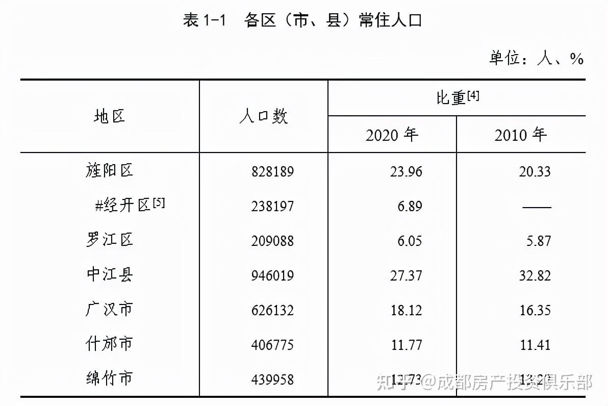 不过,德阳主城区的常住人口在增加,整体表现出明显的人口向城市中心转移的趋势。6个区(市)县中,常住人口居前三的是中江县、旌阳区和广汉市,合计占全市常住人口比重69.45%。相较“六普”数据,市辖区之一的旌阳区常住人口增加了9.3万人,此外常住人口增加的还有广汉市,而中江县十年间常住人口减少了24.1万人。